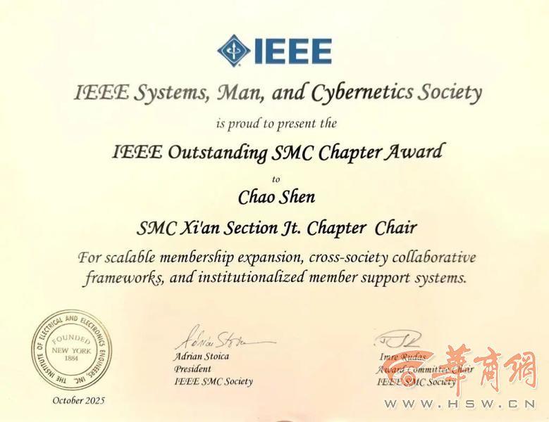 近日杠杆配资助手网,IEEE系统、人、控制论学会(IEEE Systems, Man, and Cybernetics Society, IEEE SMC)举行2025年度特别活动及颁奖仪式。由西安交大电子与信息学部沈超教授担任主席的IEEE系统、人、控制论联合学会西安分会(Xi'an Section Joint Chapter[IEEE SMCS & IEEE CSS])荣获2025年度IEEE系统、人、控制论学会杰出分会奖(IEEE Outstanding SMC Chapter Award)。